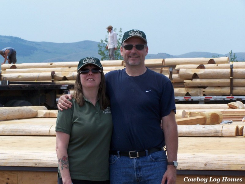 Owners of a handcrafted log home built in summer 2012 in Gallatin county Montana. Cowboy Log Homes