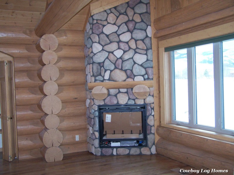 Douglas Fir Timber and Stone in log home. Cowboy Log Homes