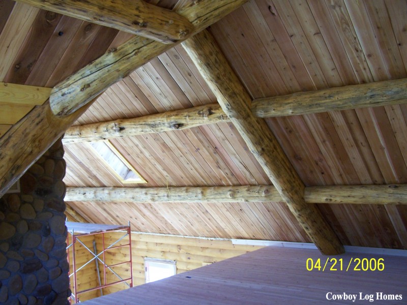 This is a post and beam log roof system with western red cedar 1×8 tongue and groove on the ceilings and a river rock stone fireplace. Circle saw flooring is also installed. Cowboy Log Homes