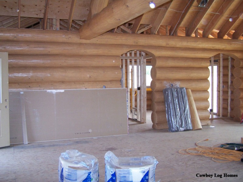 This is a log interior wall of the Bear Creek Plan that enters into the prowled great room. Cowboy Handcrafted Log Homes