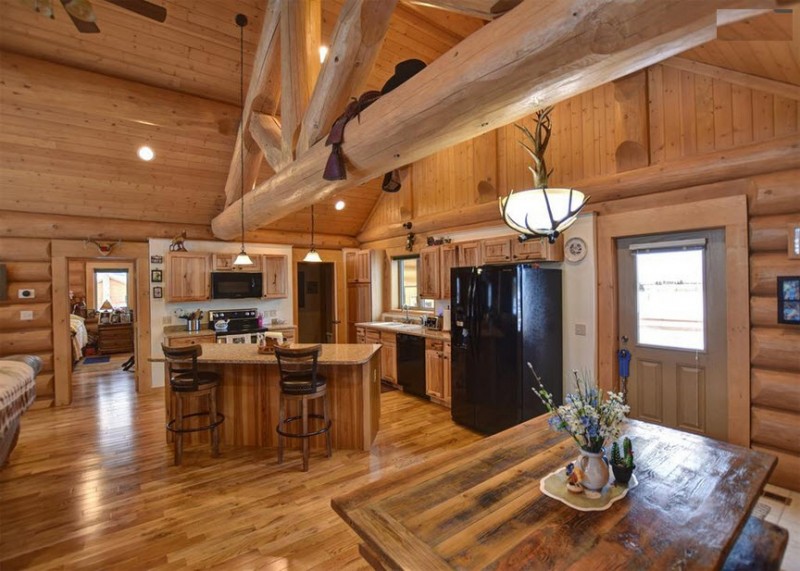 The kitchen and dining areas for this log home are combined in the great room area. Cowboy Log Homes