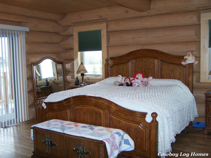 Handcrafted log home master bedroom complete with hardwood floors, tongue and groove ceilings, and solid wood furniture.  Cowboy Log Homes
