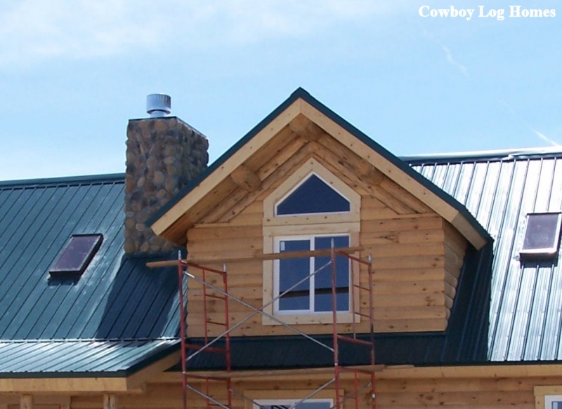 This is a log sided gable dormer with an extra angled window over the main window. The log siding is a true match to the logs. Sky lighting is also seen on the roof. Cowboy Log Homes