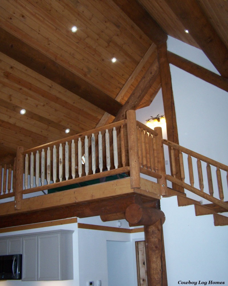 This loft has pine tongue and groove ceilings with recessed lighting. Log railing lines the loft edge. Heavy round log ridge beams,  purlins, and a log truss compose the log roof system. Cowboy Log Homes