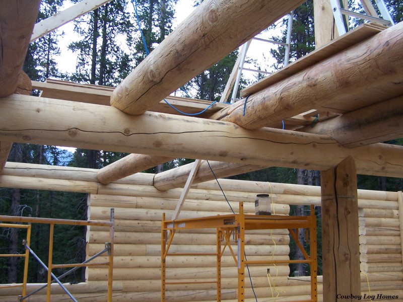 Here we can clearly see log floor joists resting on the main floor beam and tieing into the main log support post that reaches to the ridge beam. Cowboy Log Homes