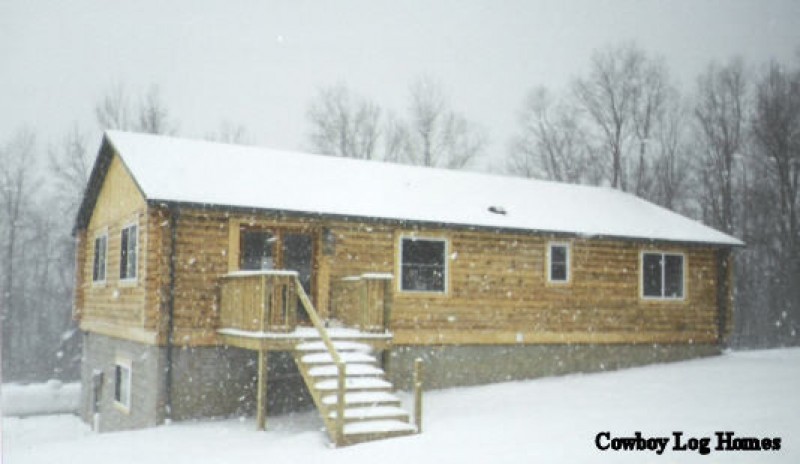This is our Creekside log home design. It is a 30×50 ranch with standard trusses. The great room has scissor trusses. The 6×12 pitch roof provides lower and unimposing lines. This home is 8×8 inch double D logs with full saddle notch corners. Tongue and groove pine is installed on the framed gable ends of the cabin. This log home is built on a full walk out basement. Three bedrooms, two baths, great room and kitchen compose the first floor. The finished basement of this home also boasts a laundry room, office, game room, full bath, and huge walk in closet. For more information on this cabin please email us directly. Cowboy Log Homes