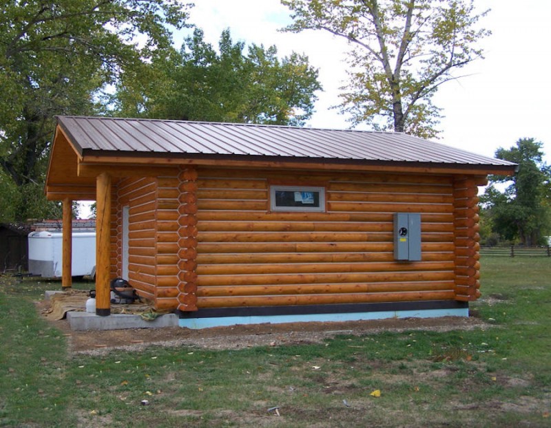 Small log cabin. Built from 8 inch milled logs and 10 inch log roof system and support posts.